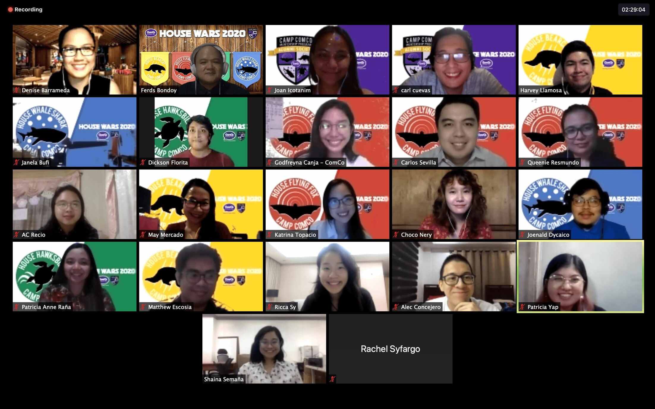 House Whaleshark is composed of members Ricca Sy from Ateneo de Manila University, Joenald Dycaico from Saint Louis University, Shaina Semaña, and Camp ComCo alumni Janela Bufi as Advisor and Jerica Jimenez as Co-Advisor. Members of House Flyingfox include Kitty Topacio from Ateneo de Manila University, Godfreyna Canja from Trinity University of Asia, Carlos Sevilla from the University of Santo Tomas, and Camp ComCo alumni Queenie Resmundo as Advisor and Eli Dailo as Co-Advisor.