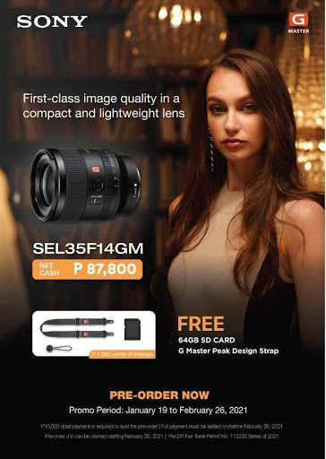 Pre-order the SEL35F14GM and get an exclusive bundle of a 64GB SD Card and G Master Peak Design Strap! Promo period is until February 26, 2021, so what are you waiting for? Head to the nearest Sony Authorized Camera Dealers now!